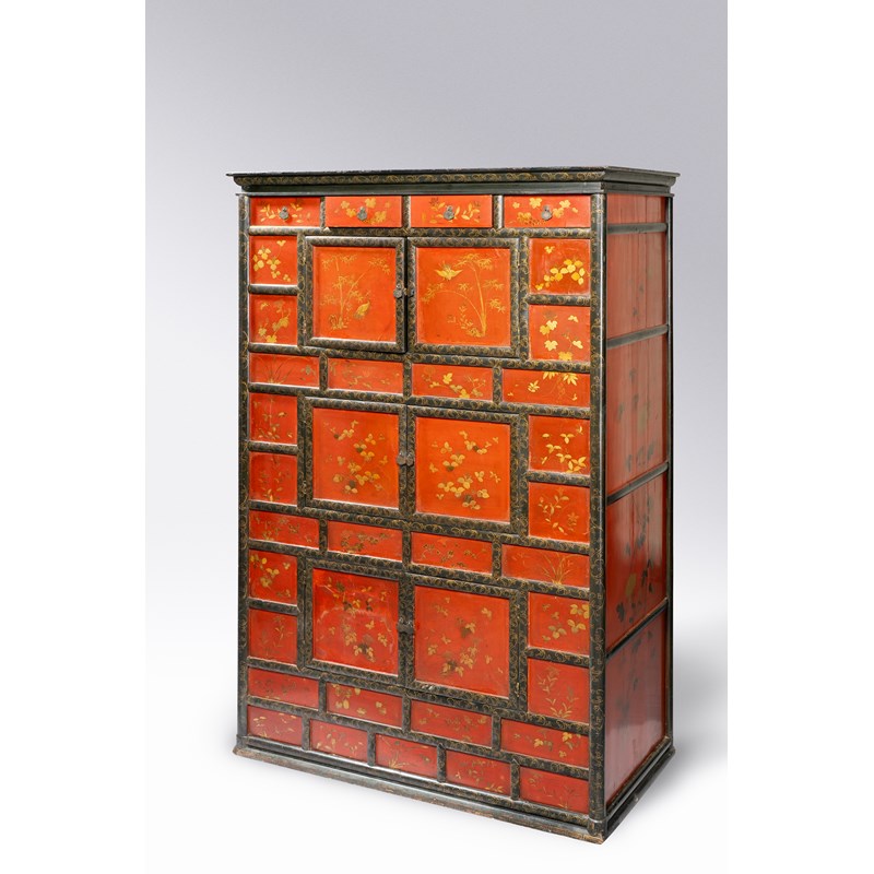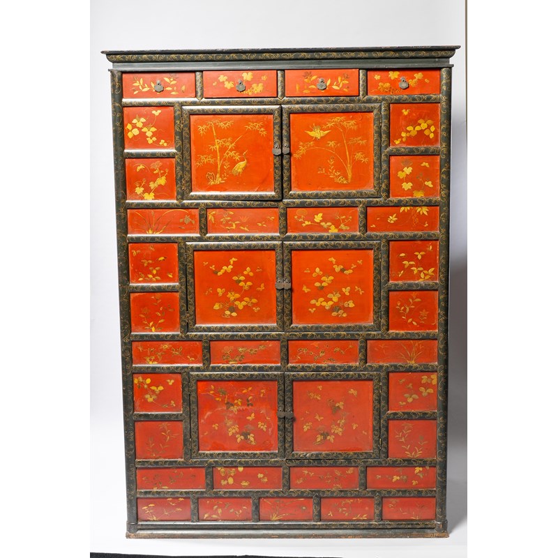 Possibly Ryukyu Islands, the tall rectangular front with many panels painted with vines, leafy tendrils and flower sprays, the top row with four drawers; three pairs of doors below opening to reveal the inside, the top two doors embellished with cranes; all within black borders embellished with scrolling tendrils painted in gilt; the sides with further panels of flowers,139cm x 96cm x 51cm. (5)