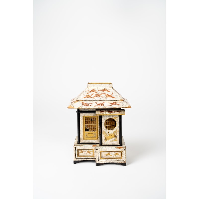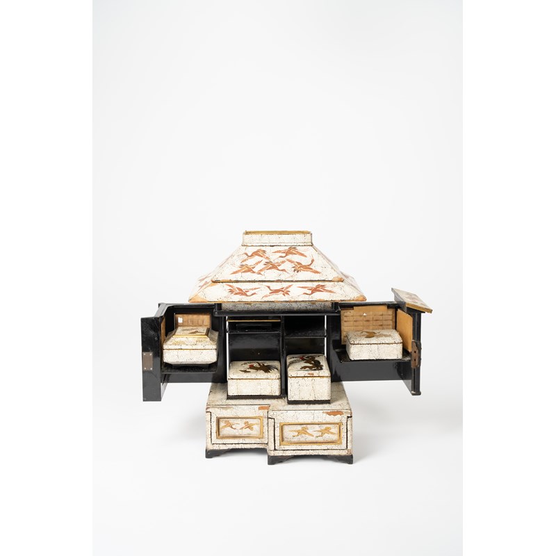 Shaped as a pavilion and decorated with many cranes in flight on the white eggshell ground, the walls opening to reveal many boxes decorated with chickens and further cranes, some in tsugaru lacquer, 24cm x 11.3cm x 15cm. (a lot)