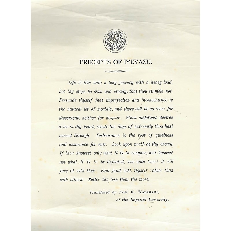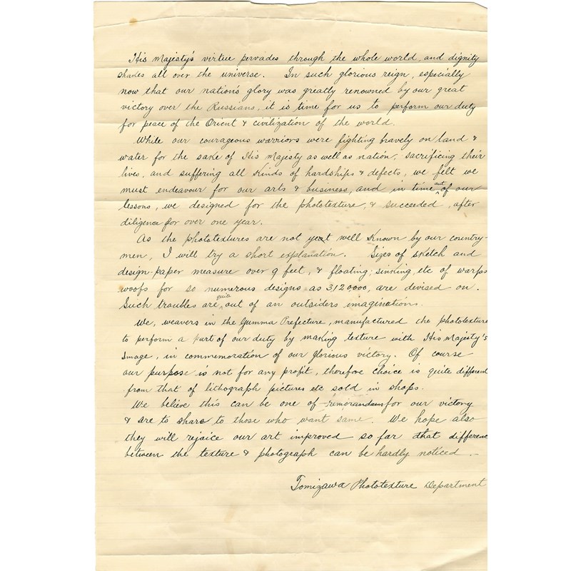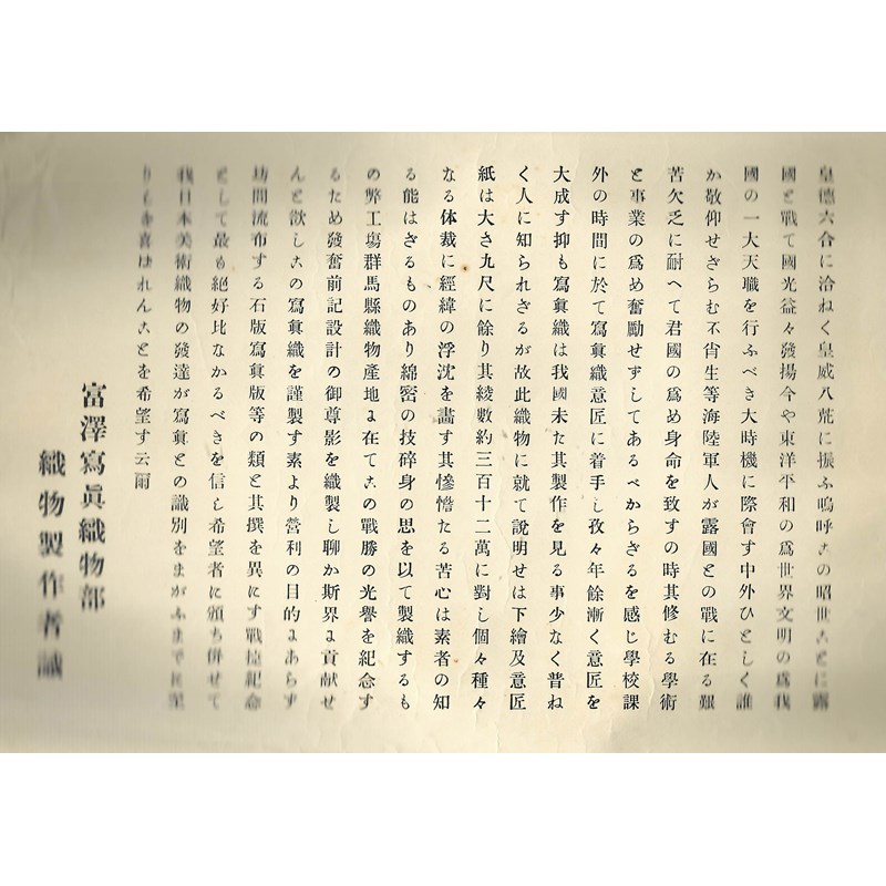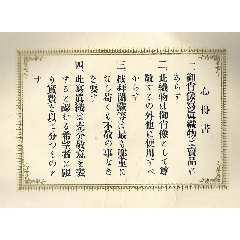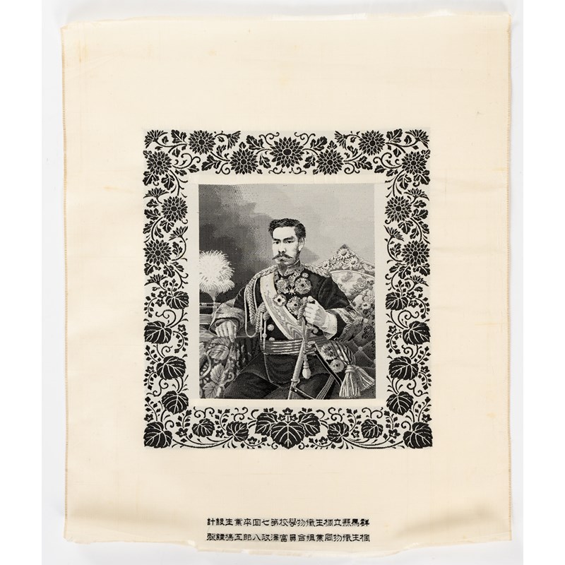 With the official portrait of the sovereign after the drawing by Eduardo Chiossone (1888), depicted seated by a table, his hat with feathered plumes beside him and holding the hilt of his sword; framed by a border of chrysanthemum, paulownia, and leafy tendrils; with two lines of inscriptions below; together with paper ephemera, including two printed Japanese texts, a translation of the ‘Precepts of Iyeyasu’ by K. Wadagaki of the Imperial University and a description of the process of phototexture signed ‘Tomizawa Phototexture Department’; the silk panel pasted to a paper scroll mount, 37cm x 30cm. (5)