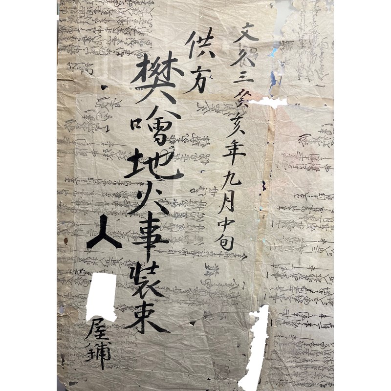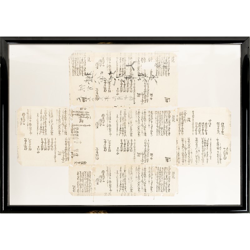 The garment and plastron made of woven cotton fabric dyed a light blue colour, both with white appliqués with raised gold embroidered edges in the shape of three-branch star mon crests, the top of the breastplate with further formal designs and the back with a stylised reishi head, a paper lining to the inside which has been removed, framed and glazed, with many lines of calligraphy referring to the fire station and dated 'middle of the ninth month, Bunkyu 3 (1863)', the jacket 124.5cm x 99cm, the frame 99cm x 137cm. (3)