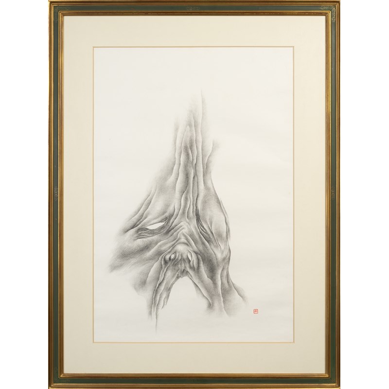 A Japanese drawing, pencil on paper, depicting the upper half of a grimacing face, the hauntingly distorted features resembling a gnarled tree trunk, sealed, framed and glazed, with a label to the back dating the work to the month of February, Showa 57 (1982), 64cm x 44cm.