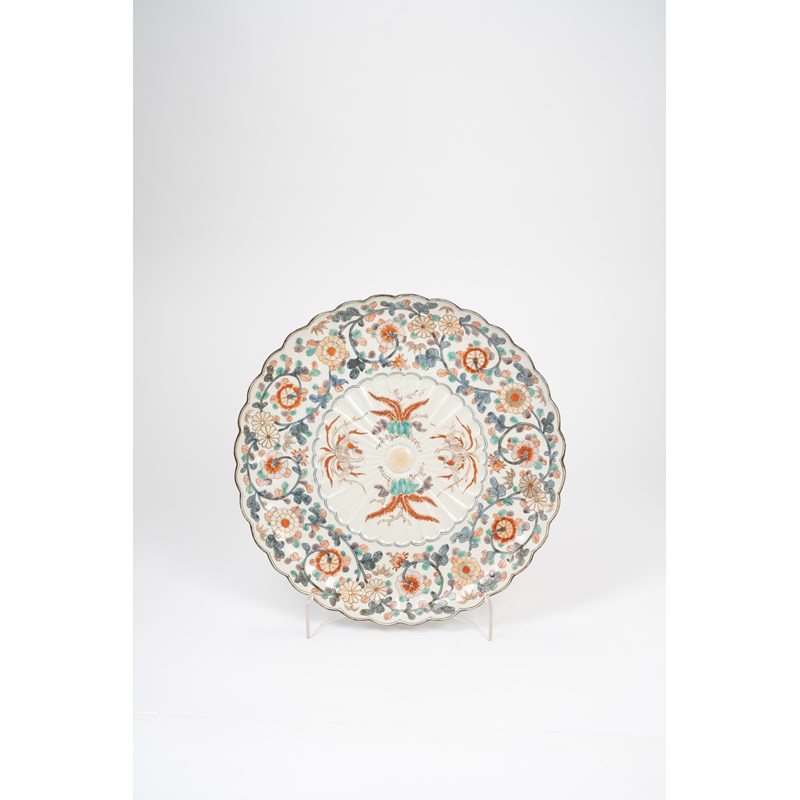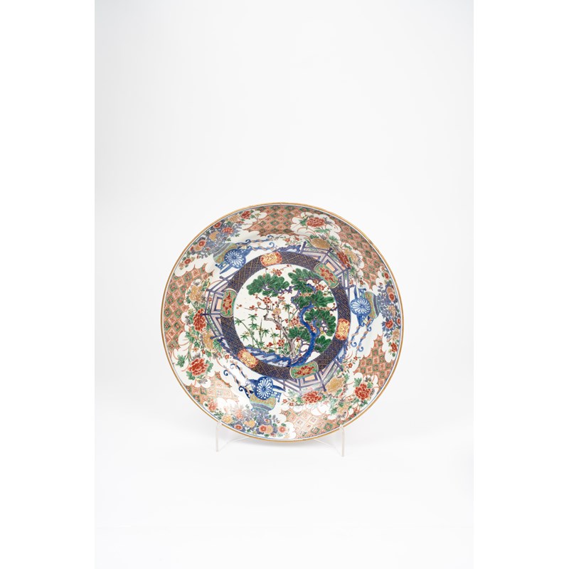 All decorated in underglaze blue, gilt and polychrome enamels, one with a foliate rim and moulded to the centre with a large chrysanthemum, painted with ho-o birds in flight, paulownia branches, chrysanthemum and scrolling tendrils; another also with moulded elements and painted with two peacocks by a gnarled prunus tree to the centre, the cavetto and rim with bands of flowers, birds and butterflies; the third in Kenjo Imari style with three carts laden with vases of flowers, brocade patterns and further blooms, 54.2cm max. (3)