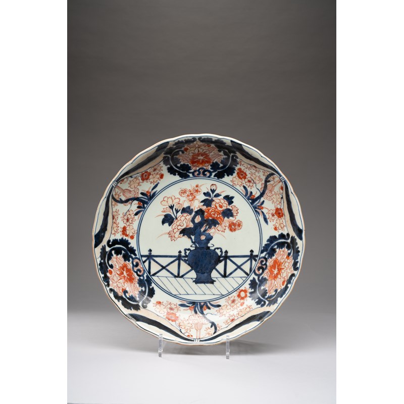 Typically painted in underglaze blue, gilt, red and orange enamels, the well decorated with a large vase of flowers by a fence, the cavetto and rim with a wide border of flowers, stylised leaves, and tasselled curtains, the underside with three sprays of chrysanthemum, prunus and peony, 34cm.