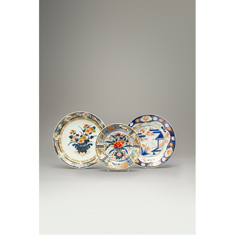 AN UNUSUAL JAPANESE PORCELAIN STRAINER AND TWO IMARI DISHES EDO PERIOD