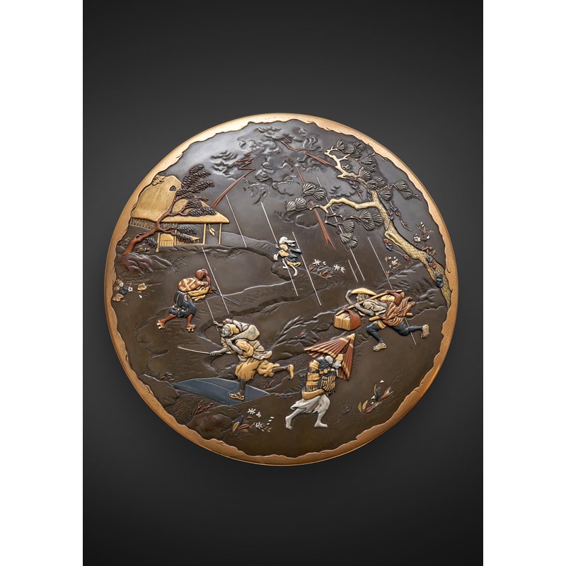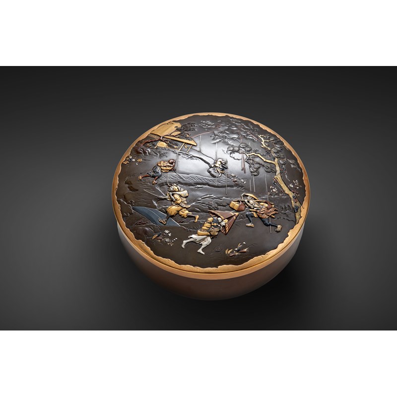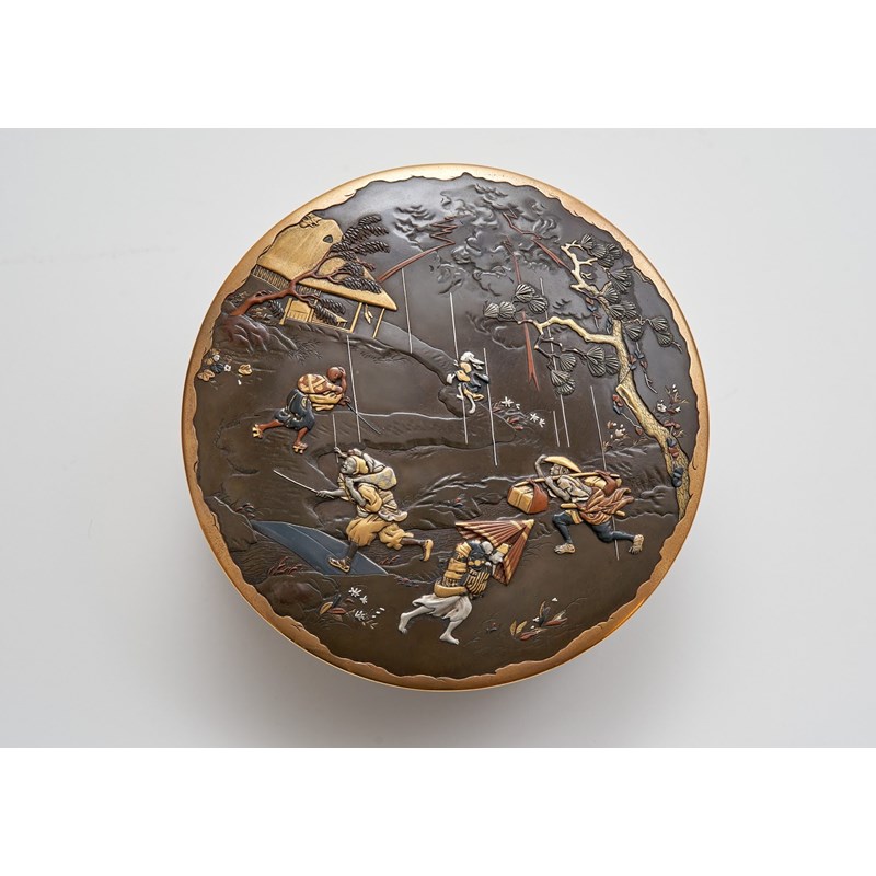 The cover of the box decorated with a dynamic scene of figures caught in a storm and running for cover, including one woman with a small child on her back shielding herself with a broken paper umbrella; a sarumawashi, the monkey trainer carrying his pet on his shoulders whilst crossing a small bridge; with lightning bolts emerging from menacing clouds towards a thatched hut and a leaning pine, the design rendered in relief with a variety of metals including gilt bronze, silver and shibuichi, the round body signed to the base Saikyo Inoue sei (made by Inoue of West Kyoto) and with a gold seal for Fusahiro, 19.7cm. (2)