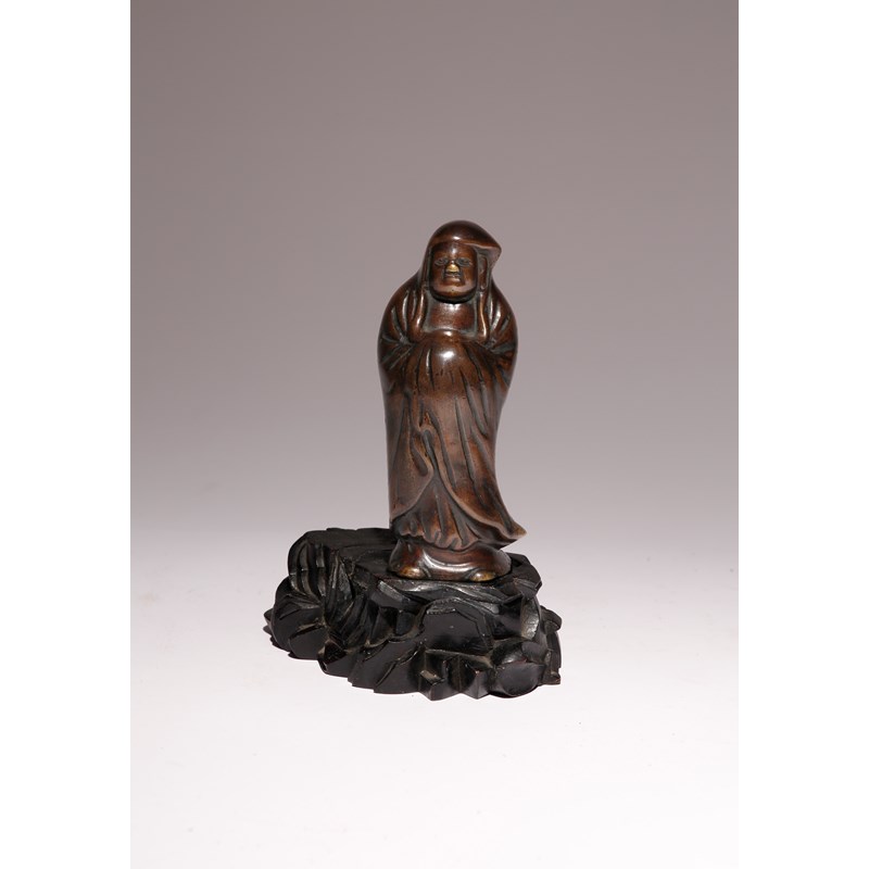 The Father of Zen Buddhism depicted standing, wearing long robes covering his head and revealing his chest, raised on an associated wood stand carved as a rocky outcrop, the bronze 13.5cm. (2)