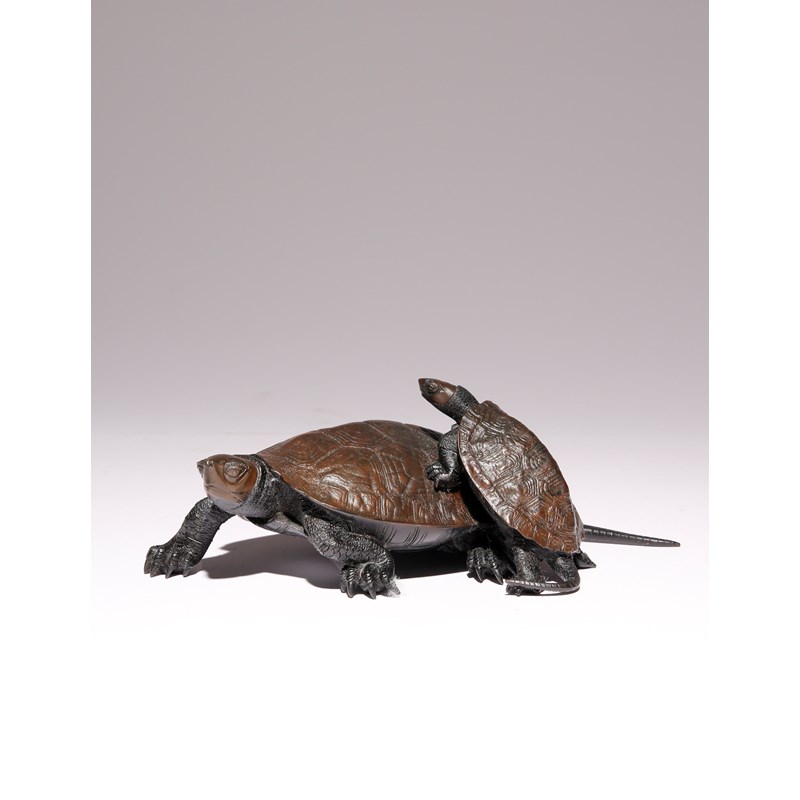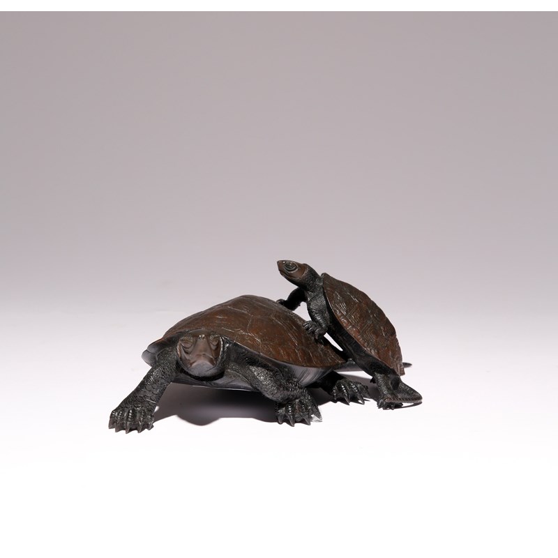 A JAPANESE BRONZE OKIMONO OF TORTOISES BY KOSE