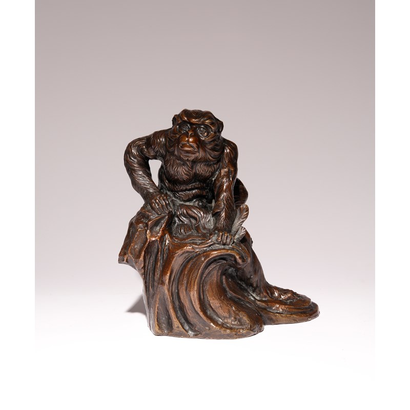 Realistically modelled, the primate sits on a rock and turns to his right in an inquisitive manner; he holds three large feathers in his left hand, possibly belonging to the bird he is gazing at; the base with an illegible impressed mark, possibly for Koun, 27cm.