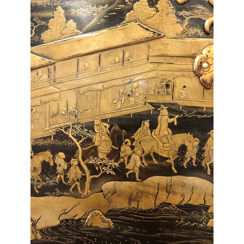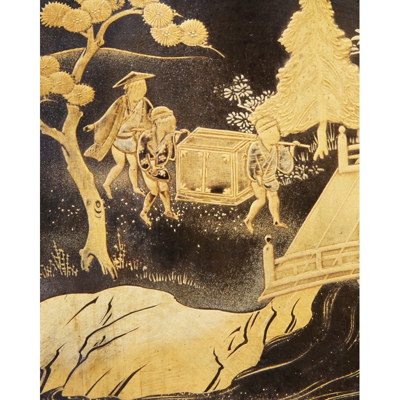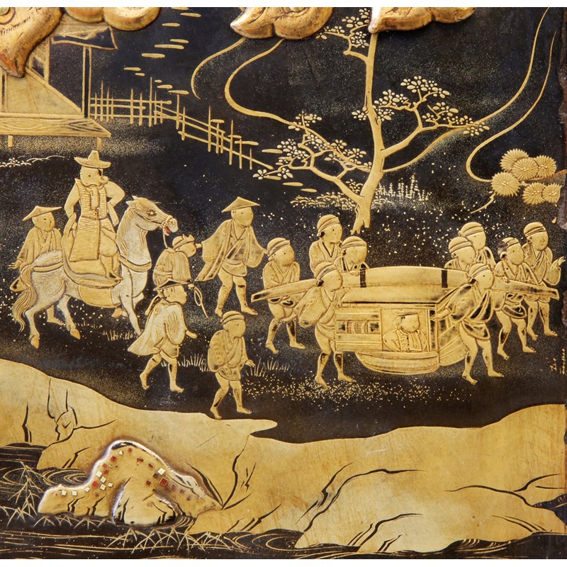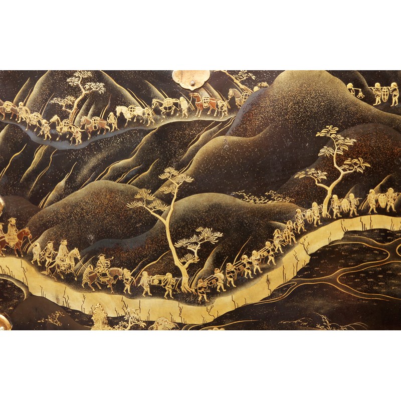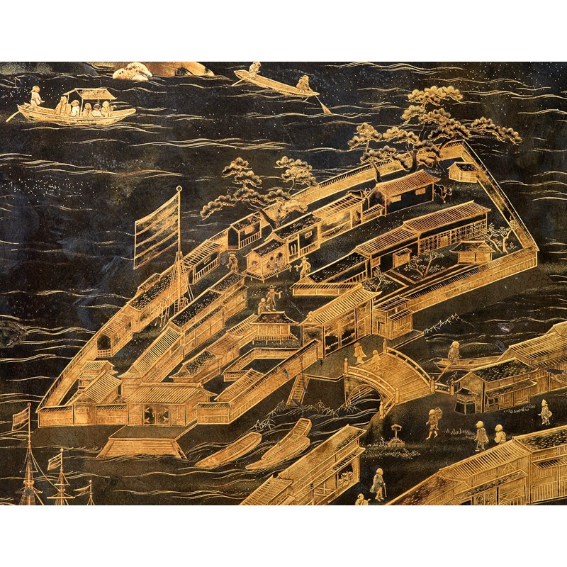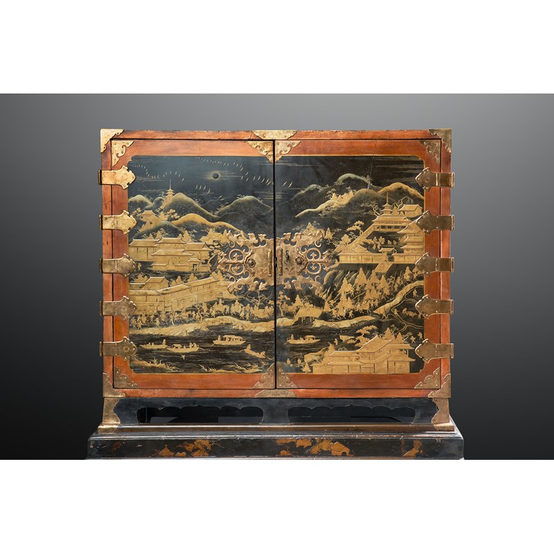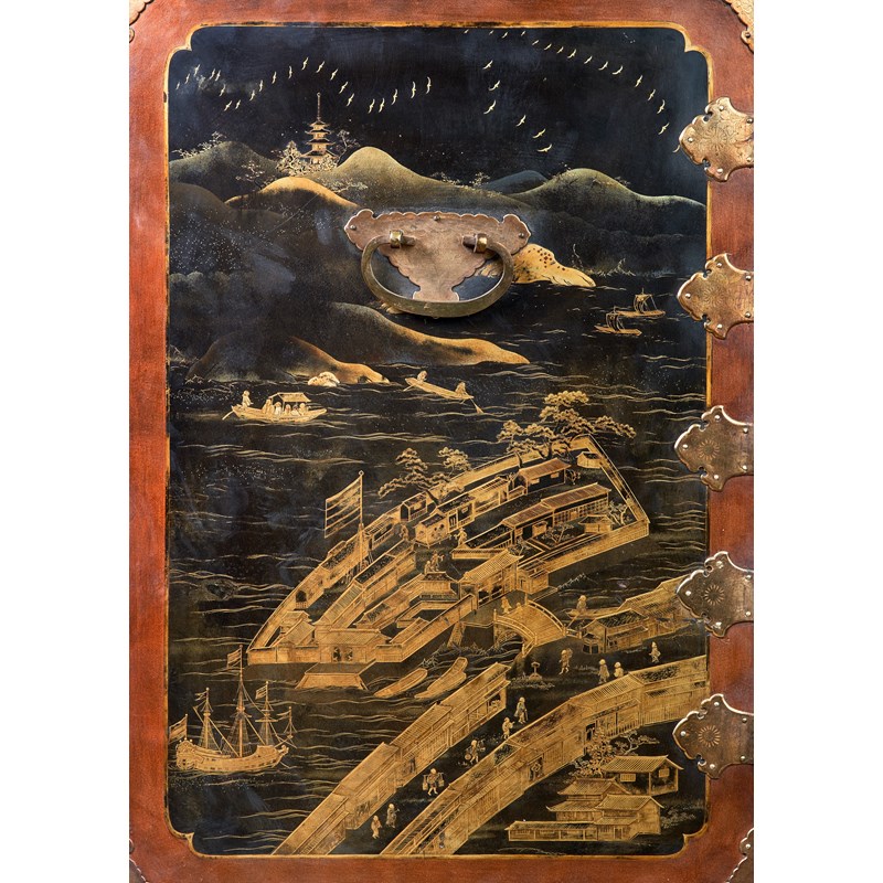 Of rectangular form with a flat top, the sides and front embellished in gold, silver, brown and red lacquer hiramaki-e on a deep black roiro ground with a continuous design, the large panels depicting a complex scene of many figures in a mountainous river landscape; the left side with a rare depiction of the island of Dejima, a three-masted fluyt (cargo ship) sailing toward it, flying the tricolour flags of the Dutch East India Company and the stern with a small monogram reading VOC. The right-hand side of the panel depicts a busy street of Nagasaki leading to the Dutch island, with many figures in traditional garments engaged in daily life; a small wooden bridge leads to the fan-shaped artificial island, three Dutch men are visible outside the buildings and two Japanese figures sit in seiza in a small hut in the centre, probably guards. Japanese boats sail in the distance, and a four-storey pagoda with many birds flying above are visible behind. The front doors are decorated with a long procession, the many travellers on foot and on horseback, three of the horse riders dressed as Dutch merchants and a fourth figure, probably the Opperhoof (chief trader), is seen in a palanquin. Many Japanese figures on either side of the procession are engaged in various activities: some play musical instruments on board of small boats, others are fishing; figures inside buildings are depicted playing go, and farmers to the side are tending to their rice paddocks. The upper half of the right door depicts a large mansion, probably the local daimyo's castle, with men kneeling before another figure in the central courtyard. The right side of the cabinet is painted with further horse riders and their retinue journeying through mountains.