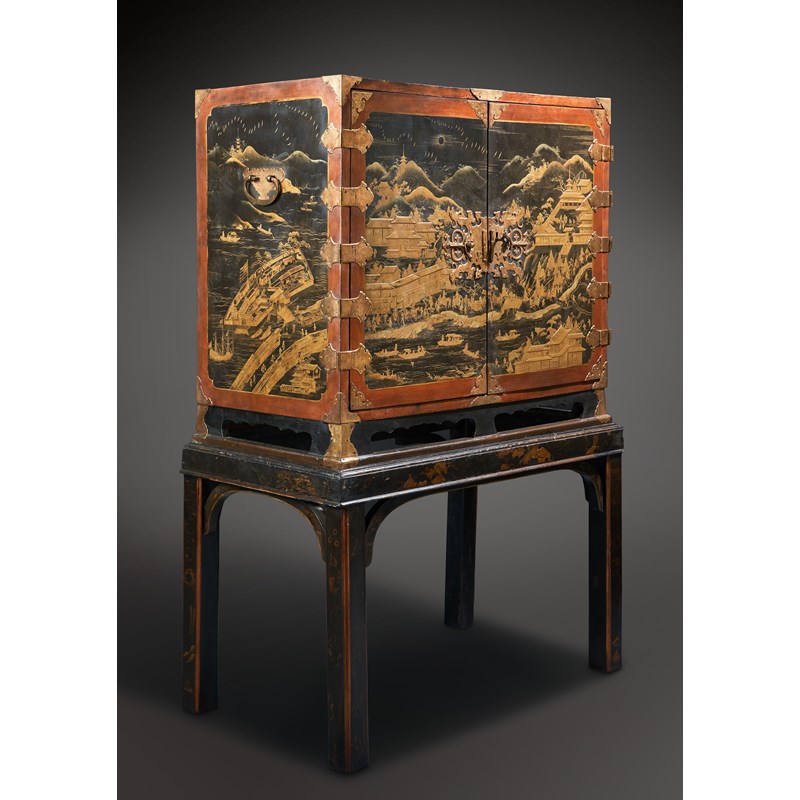 Japanese lacquer cabinets such as lot 1046 were very expensive and as such, they were seen as a luxury item worthy of European courts. This cabinet is a good example of the type of export lacquer popular in the 17th century for its decoration of mountainous river landscapes. The shape is adapted from earlier Portuguese and Spanish escritórios or bargueños concealing many drawers of various sizes. Japanese lacquer was a luxury commodity, and it became even more sought-after when Japan restricted relations with the rest of the world after 1639. Some of the most prestigious commissions for these high-quality lacquer cabinets include Cardinal de Mazarin’s order for sixty coffers and cabinets in 1661, largely decorated with landscapes and figures. One of these magnificent coffers is now on display at the Victoria & Albert Museum, access. no.412:1, 2-1882.