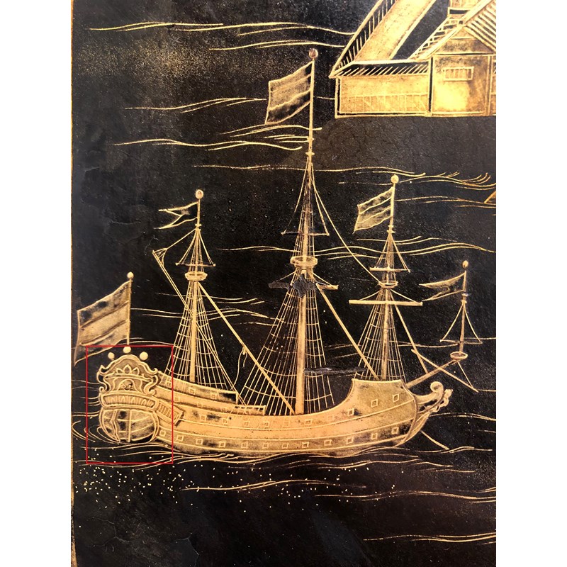 The decoration with many figures engaged in daily activities is reminiscent of rakuchu rakugai zu (Scenes in and around the Capital), a style of paper screens decorated with bird’s eye views of the busy streets of the old capital of Kyoto. The Japanese figures here are depicted fishing, playing musical instruments on boats, tending to their fields, playing go, and paying tribute to the local lord.