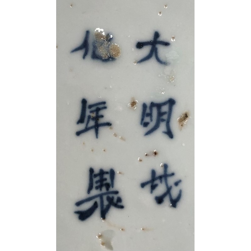 The well decorated with a central medallion enclosing a plump rabbit within four radiating fan-shaped panels, variously painted with key fret, scales, cell diaper, or Y-pattern, with four cash symbols to the cavetto and a border of formal scrolling tendrils, the rim with typical mushikui frits, the underside with two flower sprays and butterflies, inscribed Da Ming Chenghua nian zhi to the base, 20.5cm.