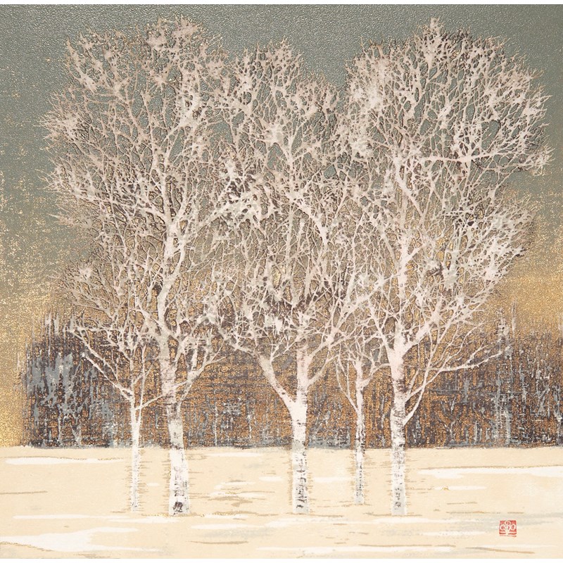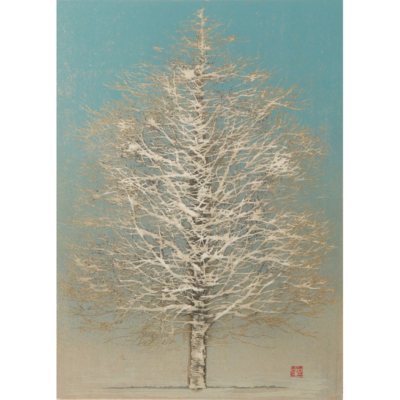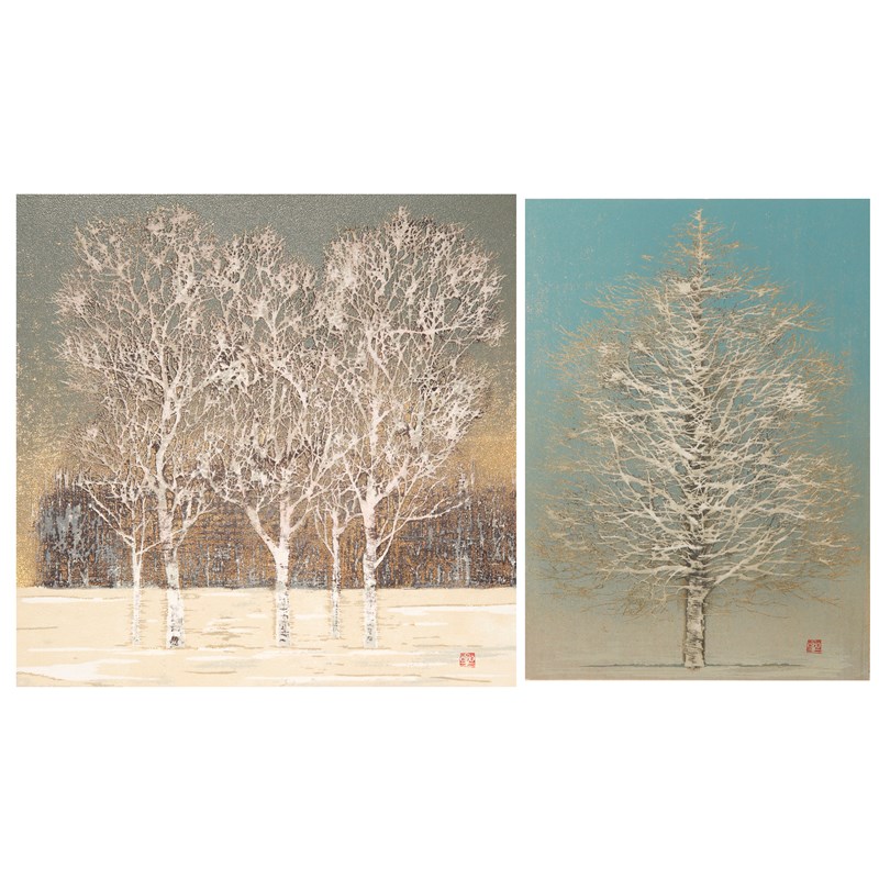 Two Japanese woodblock prints with metallic pigments depicting trees, the first rectangular picture entitled Soshun (Early Spring) with a single birch, framed and glazed; the second loose square print entitled Fuyu kodachi (Trees in Winter) depicting a small grove, both signed in pencil and dated by the artist, 24.5cm x 24.5cm max. (2)