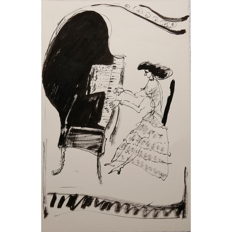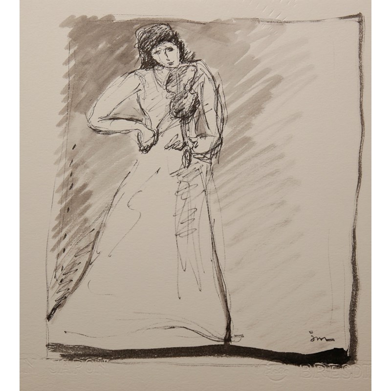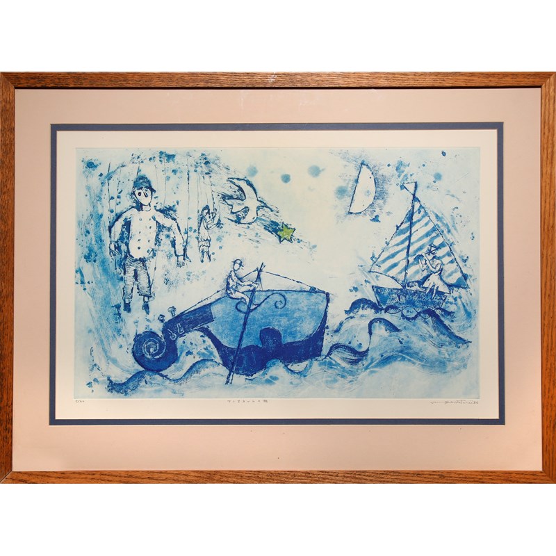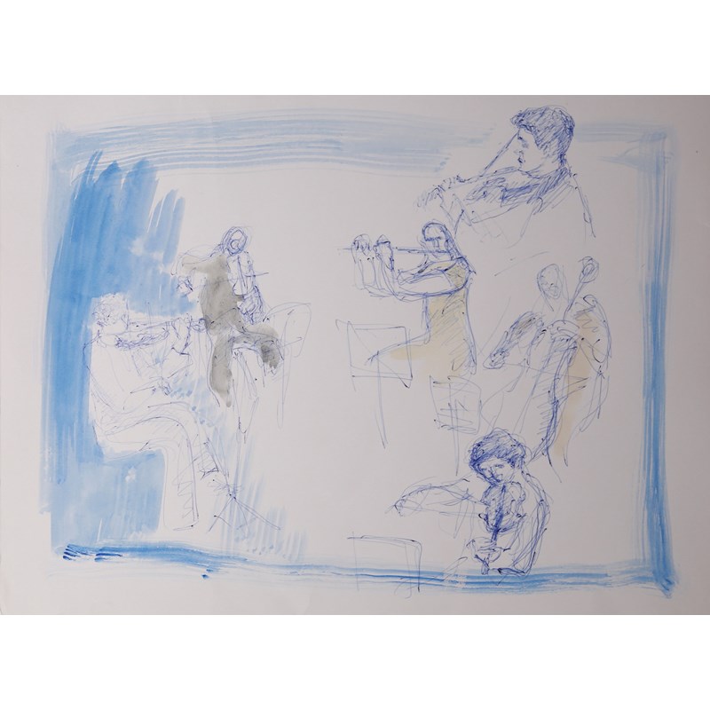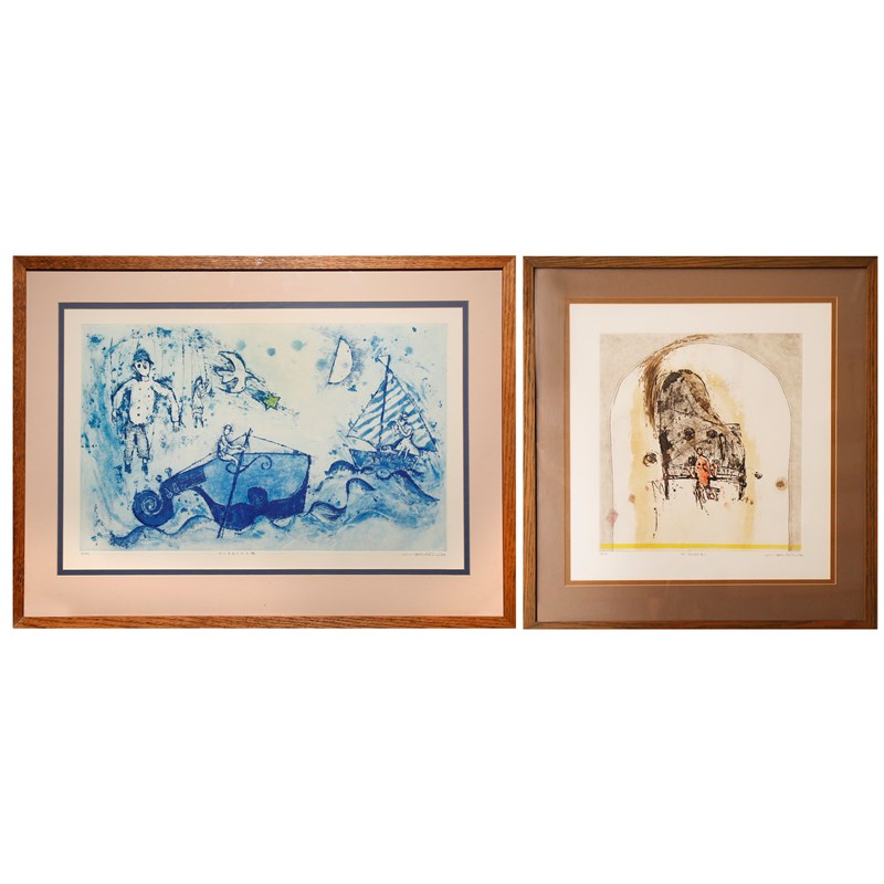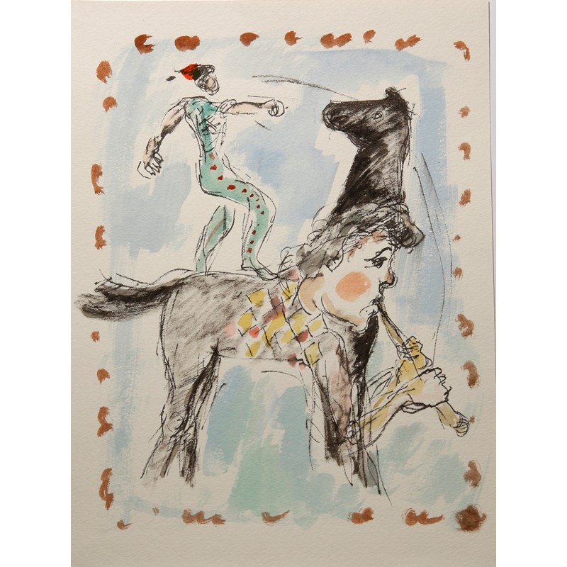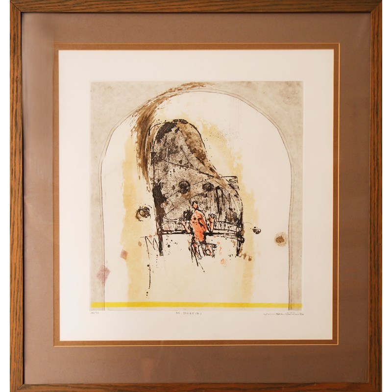Two Japanese limited editions colour etchings, one entitled 'The Marionette's Travels', numbered 5/60, the other entitled 'On Stage (G)', numbered 12/50, both signed in pencil underneath, framed and glazed; together with four loose sketches depicting musicians, possibly by Watarai, 36.1cm x 59.1cm max. (6)