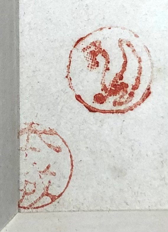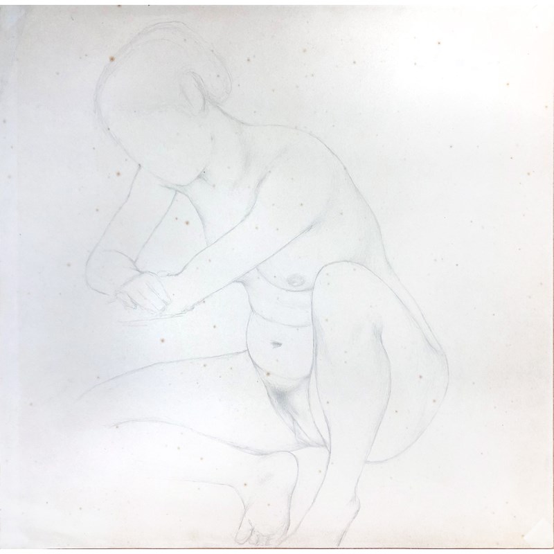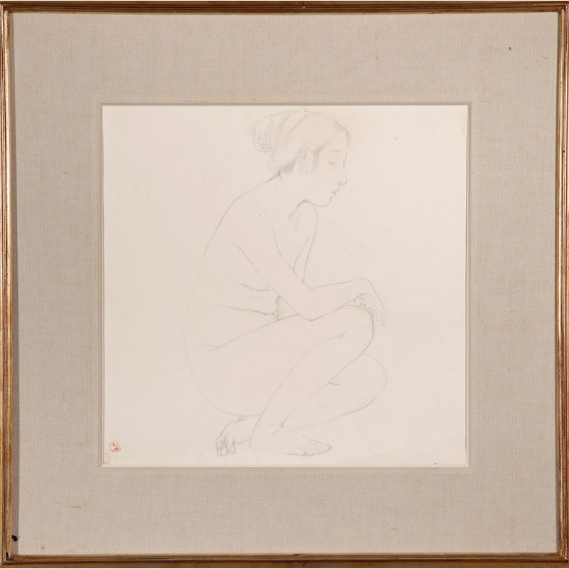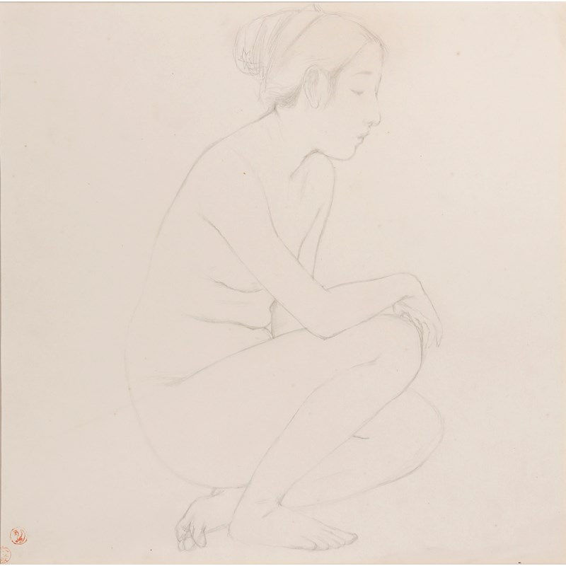 A Japanese pencil study of a nude, possibly by the artist Hashiguchi Goyo (1881-1921), the beauty depicted comfortably seated, her eyes lowered, with two red seal marks to the bottom left corner, one reading Honjo, the reverse with another incomplete nude, framed, 33.5cm x 33.5cm.