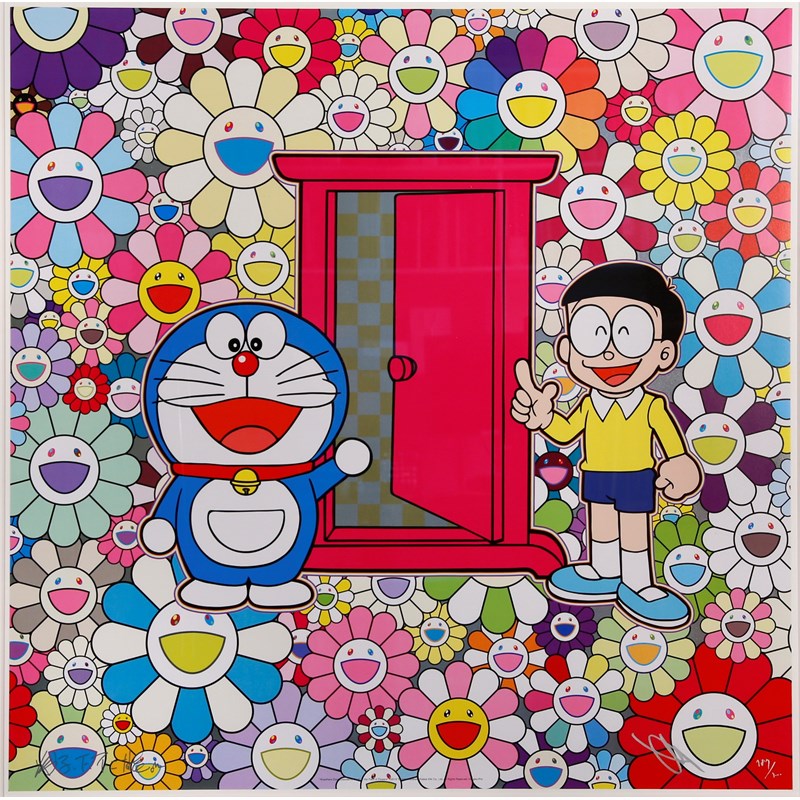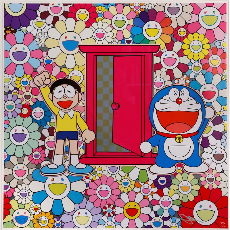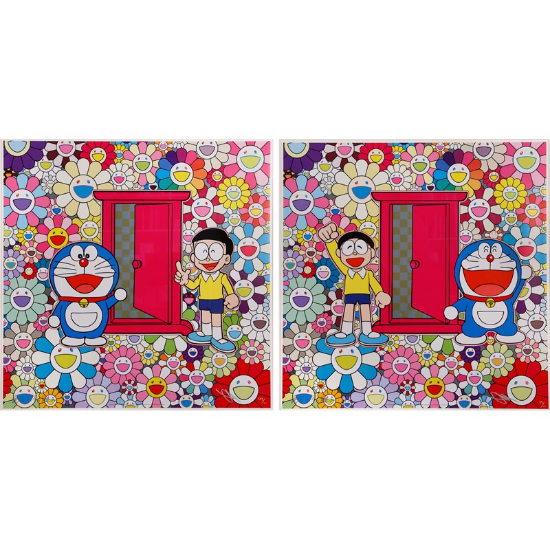 Two limited edition offset lithographs printed in colour on wove paper, one entitled 'Anywhere Door (Dokodemo Door) in the Field of Flowers' and the other 'We Came to the Field of Flowers through Anywhere Door (Dokodemo Door)