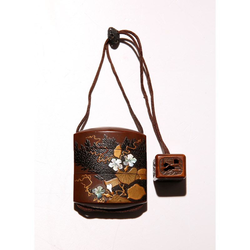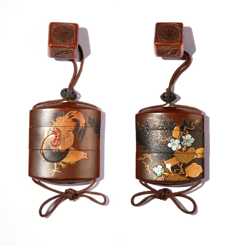 The wide body decorated with gold takamaki-e, black and red lacquer and raden mother of pearl inlays on the rich chocolate-brown ground, one side with a large cockerel and a hen and the other with large flowers and foliage, the flanges to the interior decorated with cracked-ice patterns, the base with a six-character signature for Mizutani Shutoho, with a filigree metal ojime and a wood netsuke carved in openwork with views of thatched buildings by pine trees, together with a kiri box, the inro 7.6cm. (2)