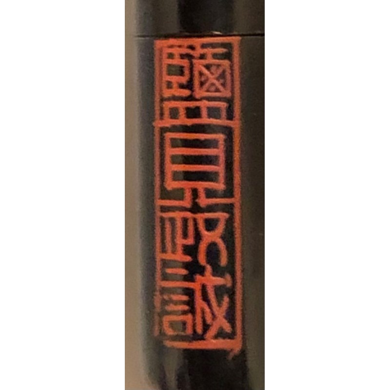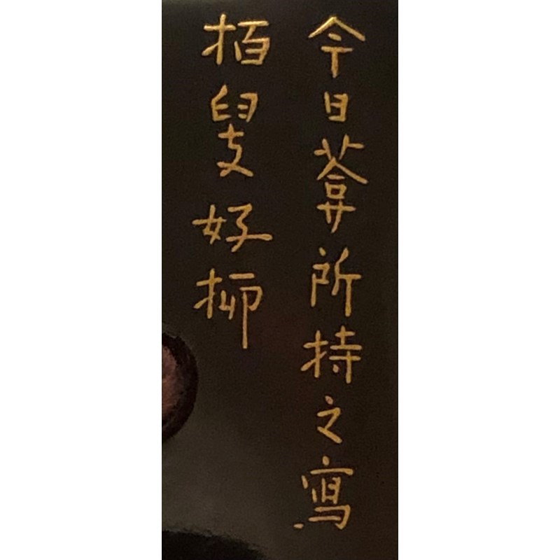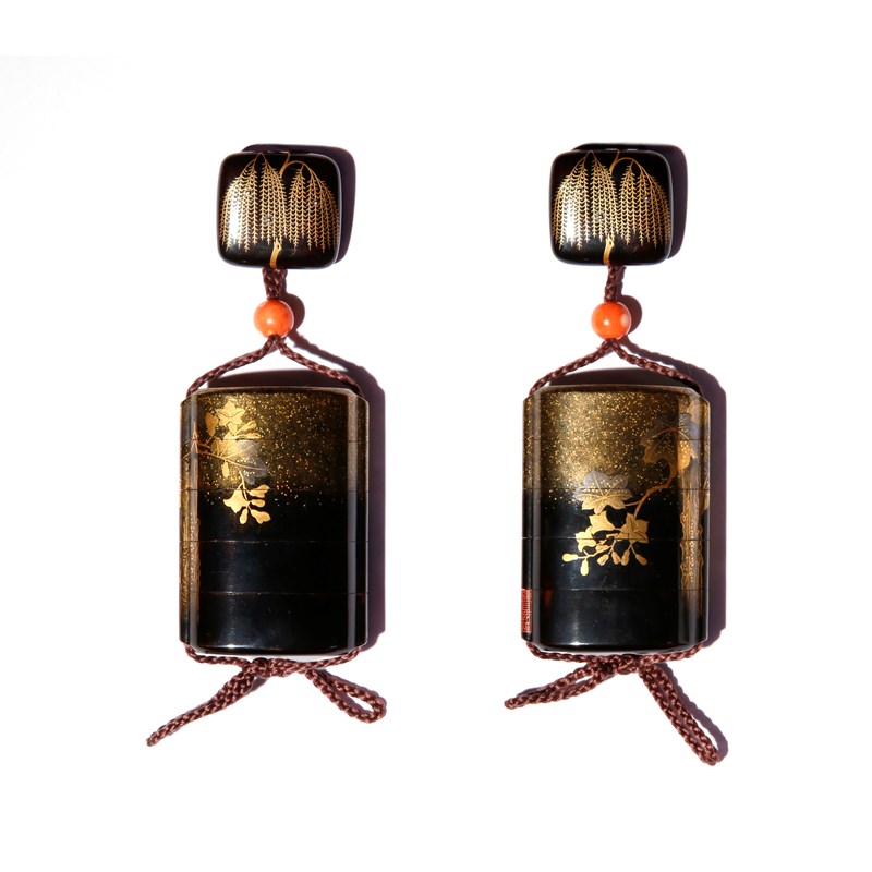 Decorated with a continuous design of a flowering tree in gold and silver takamaki-e, nashiji and hiramaki-e on the black roiro ground, signed in red lacquer to the side with a four-character seal mark in a rectangular cartouche for Shiomi Masanari, attached to a coral ojime and with an en-suite square manju netsuke, decorated with a weeping willow in gold lacquer on the black ground, with three decorative metal studs, the back with a long inscription and a two-character signature for Komin, the inro 7.4cm.
