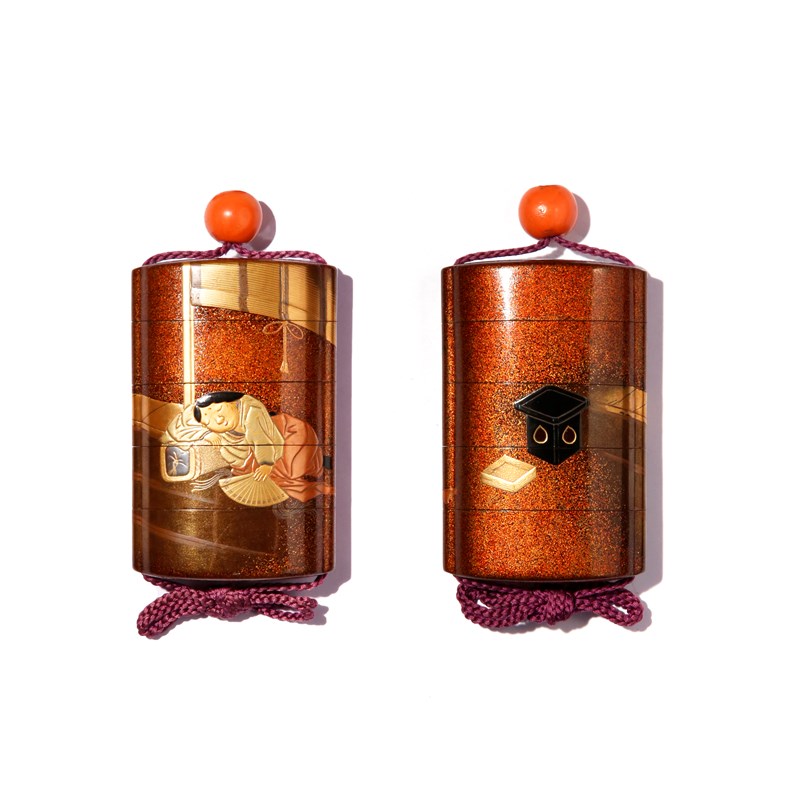 Decorated to both sides with a continuous design of Okame in an interior, the Goddess of Mirth peacefully sleeping against a large rectangular pillow whilst holding an open fan, a blind open behind her; the other side with a black lacquer tsuigasane (table tray) and a wooden tray, the designs rendered in gold, silver, red and black takamaki-e, hiramaki-e and tsukegaki on the nashiji ground, the base signed with three tensho characters, possibl for Hosen saku, attached to a coral ojime, the inro 9.2cm.