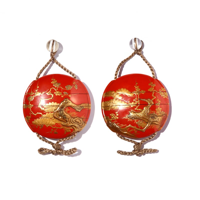 The flattened circular body richly decorated to each side with the Shochikubai (the Three Friends of Winter), with branches of pine, flowering prunus, and bamboo sprays rendered in gold and silver takamaki-e, hiramaki-e and kirikane on the deep red ground, together with a rock crystal ojime and a kiri box, 7.2cm. (2)