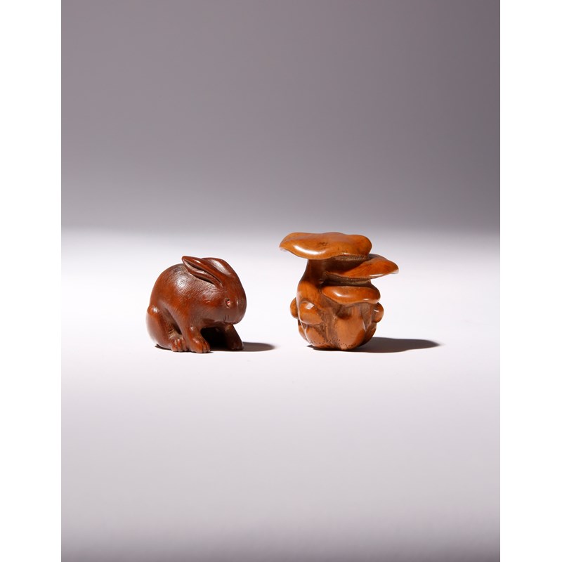The first boxwood and carved as a cluster of mushrooms, the fungi of different sizes and the stalk of one forming the himotoshi, signed Masanao underneath; the other in darker wood and depicting a small plump rabbit, its eyes inlaid with minute pink beads, 3.6cm and 3.7cm. (2)