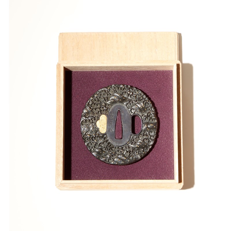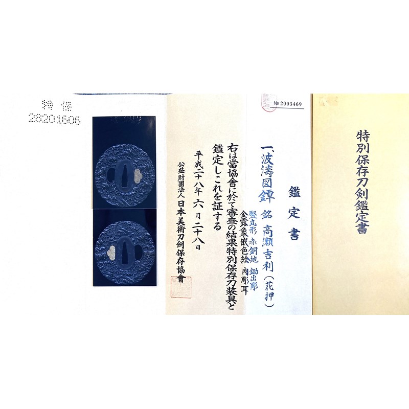 The heavy circular body decorated with an all-over design of waves in relief, the foam cleverly rendered with gold inlays, signed Takase Yoshitoshi with kao, with Tokubetsu Hozon Tosogu (Sword fitting Extraordinary Worthy of Preservation) certificate no.2003469 issued by the Nihon Bijutsu Token Hozon Kyokai (The Society for the Preservation of the Japan Art Sword), dated 28th June 2016, in a kiri box, 7.3cm. (3)