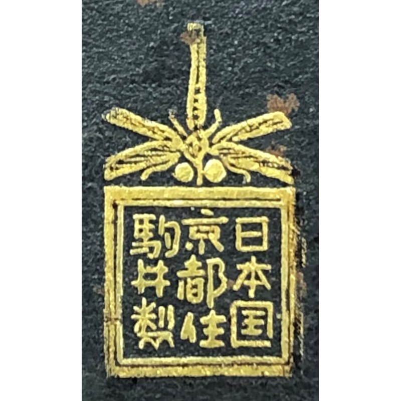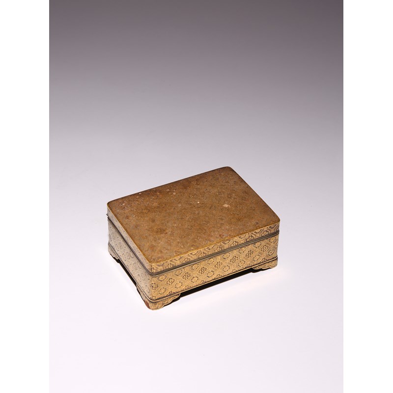 Of rectangular shape with a hinged cover and raised and four short bracket feet, decorated all over with a diaper pattern enclosing chrysanthemum blooms and four-petal flowers, the feet embellished with scrolling tendrils, the base with the dragonfly mark reading Nihon koku Kyoto ju Komai sei, 4cm x 6.6cm x 9cm.