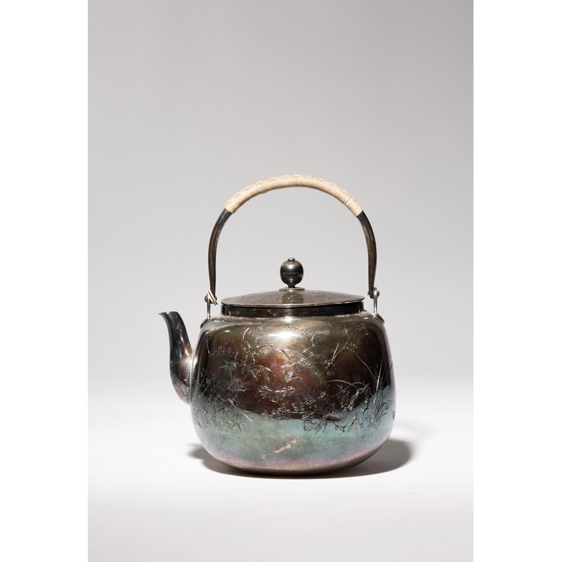 The bulbous body decorated with the Shochikubai, the Four Gentlemen (bamboo, prunus, chrysanthemum and orchids), the lid with further sprays, with a circular knop and a short curved spout, the handle wrapped in bamboo, 17.5cm. (2)