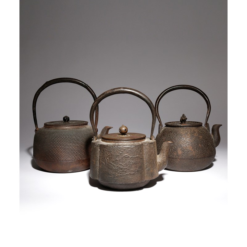 One kettle with a quatrelobed body decorated with thatched buildings in a mountainous river landscape in low relief, the handle with cherry blossoms and pine needles; another with a rough ishime texture imitating the surface of stone, the third with an all-over design of raised dots, 24cm max. (6)