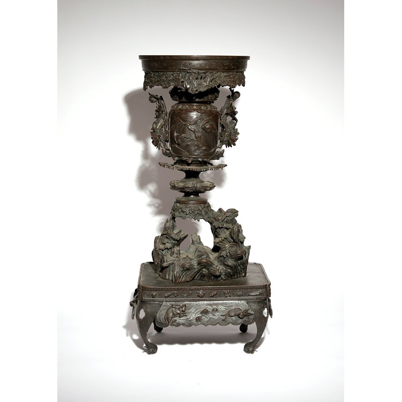 Raised on a four-legged rectangular stand decorated with hares running amongst waves and bands of Buddhist symbols, with birds perched on leafy trunks above supporting the main urn; the body of the vessel decorated with two panels enclosing further birds amongst foliage, the handles cast as large flowerheads; the top with a large flattened rim, the apron decorated with tennin flying amongst scrolling clouds, 77cm overall. (4)