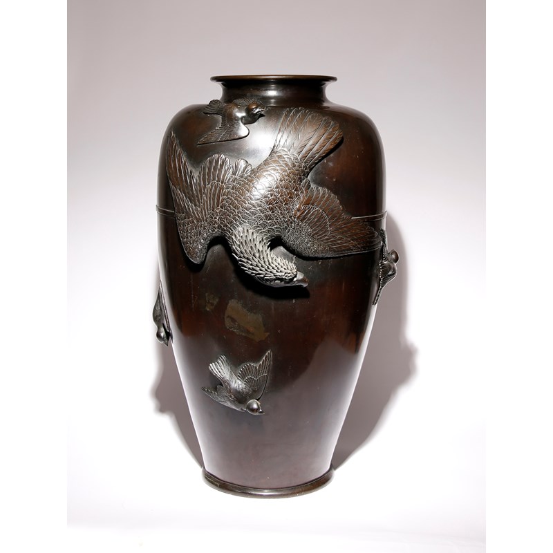 The impressive baluster body decorated with a large bird of prey in flight, five smaller chidori birds surrounding it, the raptor depicted in high relief, the back with a twelve-character mark in a square cartouche, 80cm.
