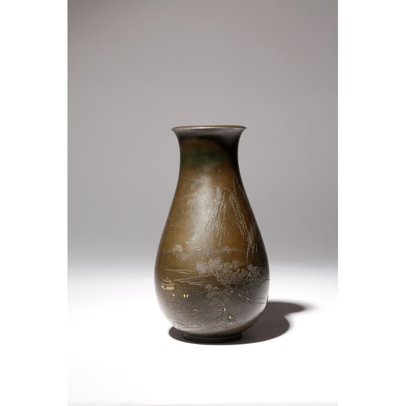 The pear-shaped body with a flared rim and raised on a short foot, the surface decorated with a continuous design of figures in a mountainous river landscape, two conversing on the balcony of a building on stilts and with a temple visible in the distance, a small boat sailing at the back of the vase; the decoration rendered with gold inlays and studs, with details in kebori and katakiribori, signed Katsunobu and with a seal for Chishinsai, 22.5cm.