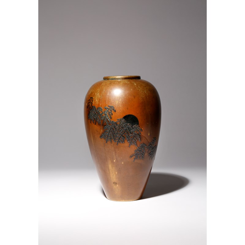 Of tall baluster shape, the body decorated with a continuous design of many pines on the slope of a hill and with a full moon emerging from behind them, the trees rendered in shakudo inlays in low relief and the celestial body in silver, all on the mottled russet-brown ground, the base with a seal for Jomi sei, 25cm.