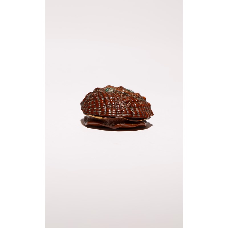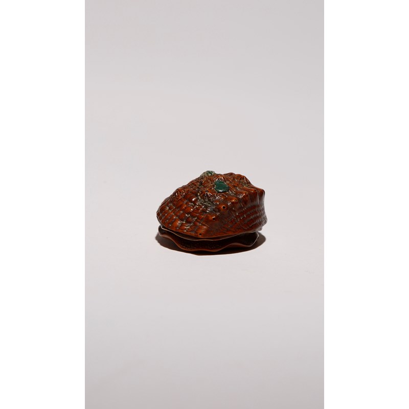 A JAPANESE LACQUERED WOOD HAKO NETSUKE OF AN AWABI SHELL