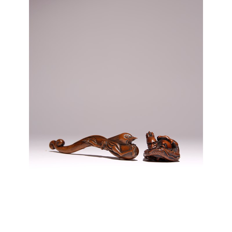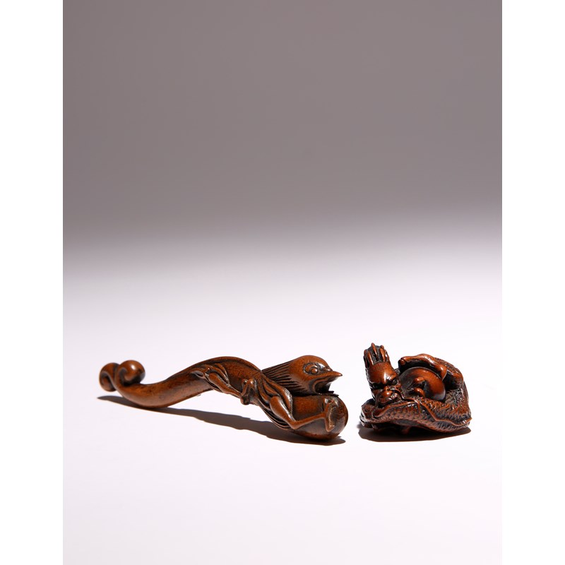 One a sashi netsuke carved as a hyriu (bird-like dragon), its beak wide open and with fire wisps engulfing its legs, its tail bifurcated, unsigned; the other depicting a three-clawed dragon coiling around a sacred pearl of wisdom, its eyes inlaid in horn, discreetly signed on the inside of its tail, possibly Miwa, 12.8cm and 4cm respectively. (2)