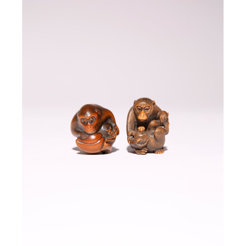 The first primate clutching a large peach before him, its eyes inlaid with dark beads and the teeth rendered in bone, signed Toyomasa underneath the fruit; the other netsuke carved as an adult and its young, the larger primate gently supporting the head of the other; their eyes inlaid in horn and signed Ikko at the back, 3.5cm and 3.8cm respectively.