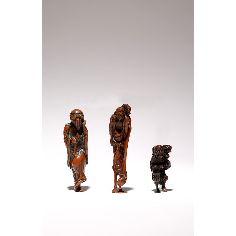 The tallest carved as Ashinaga carrying Tenaga on his shoulders, his long-armed friend holding a large fish; the second depicting a sennin standing on one leg whilst cupping his ear; the third Chodoryo Sennin holding a woven basket in one hand and supporting his pet shishi on his back with the other, signed, possibly Hachichiku, 9.5cm max. (3)
