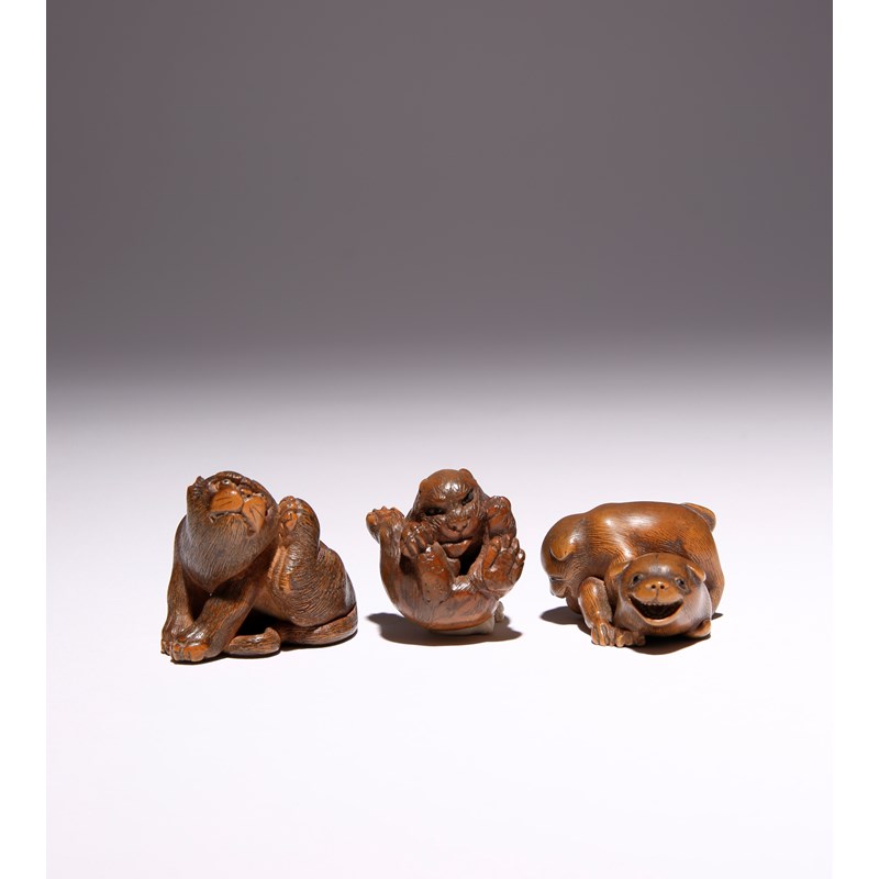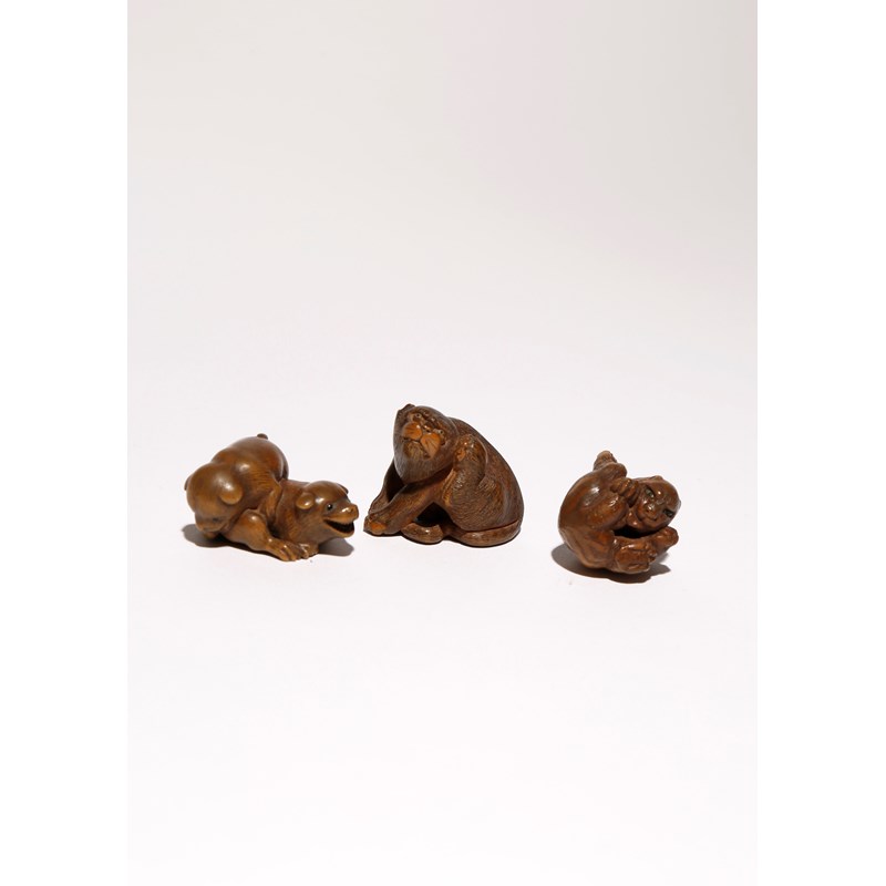The first carved as a tiger scratching its ear, its pupils inlaid and its hair finely rendered, signed Masanobu; the second depicting another tiger rolled up in a ball and licking between its legs, its eyes in gold lacquer, signed Kokei; the third depicting two puppies at play, their eyes in dark horn, signed Kikugawa, 4.3cm max. (3)