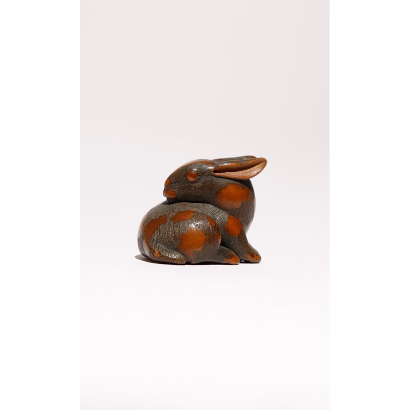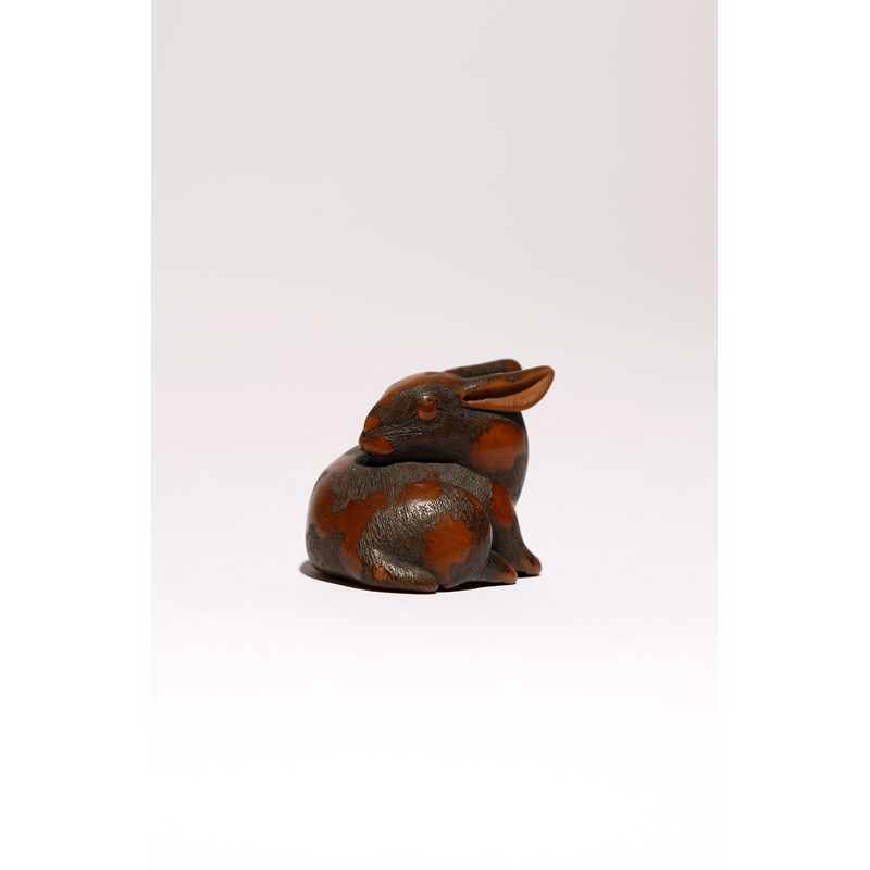 A JAPANESE WOOD NETSUKE OF A HARE WITH AMBER EYES
