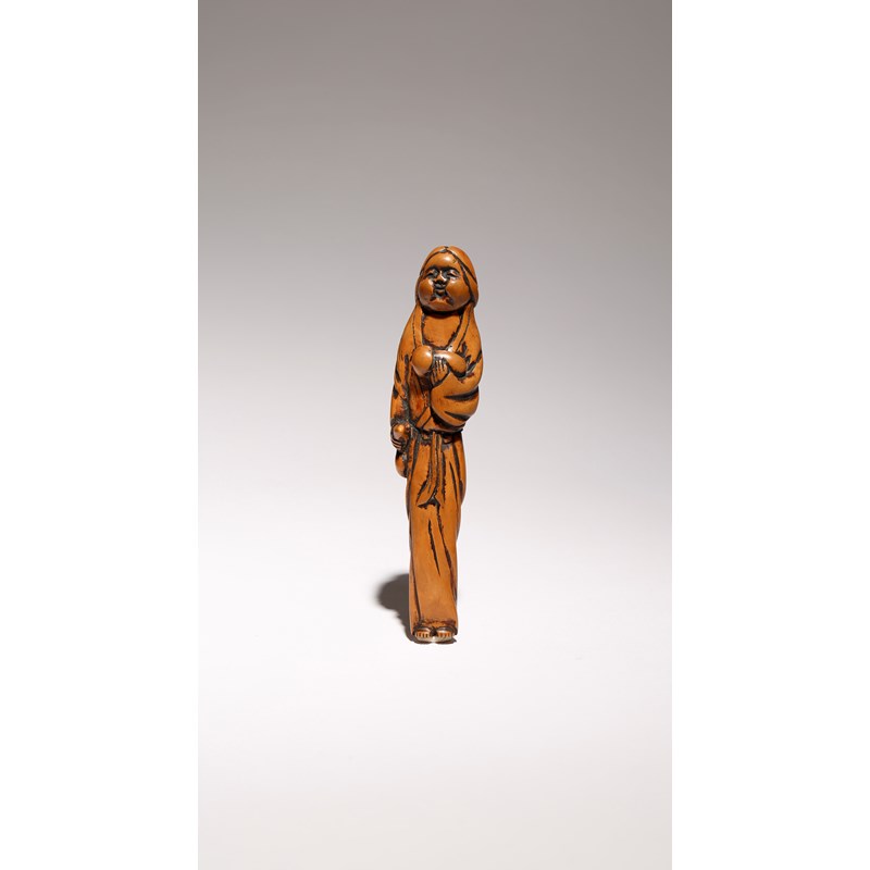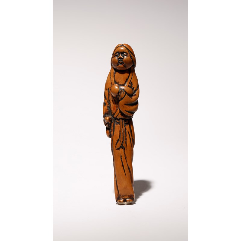 The well-worn surface carved as Okame, the Goddess of Mirth holds a rounded mushroom in one hand and a double gourd in the other, her long robes opening loosely to reveal her cleavage, she smiles contentedly, unsigned, 15.5cm.
