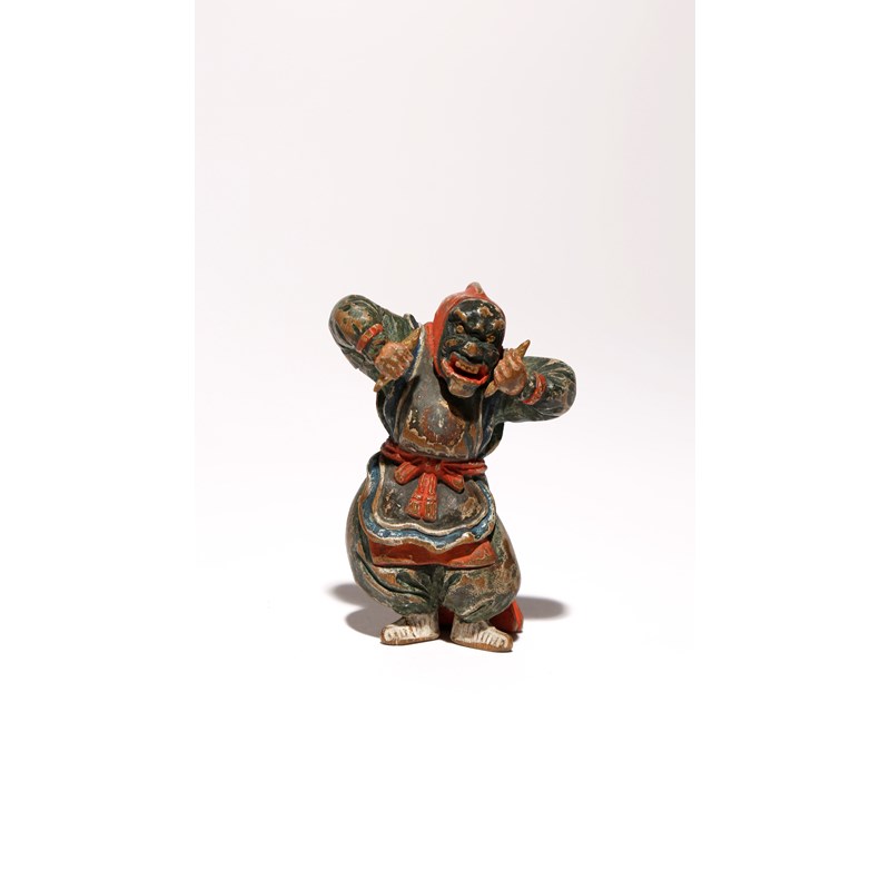 In the style of Yoshimura Shuzan, carved as a bugaku dancer performing the genjoraku, his rich garments decorated in polychrome and with some details in gilt on the hinoki (cypress) wood, unsigned, 8.5cm.