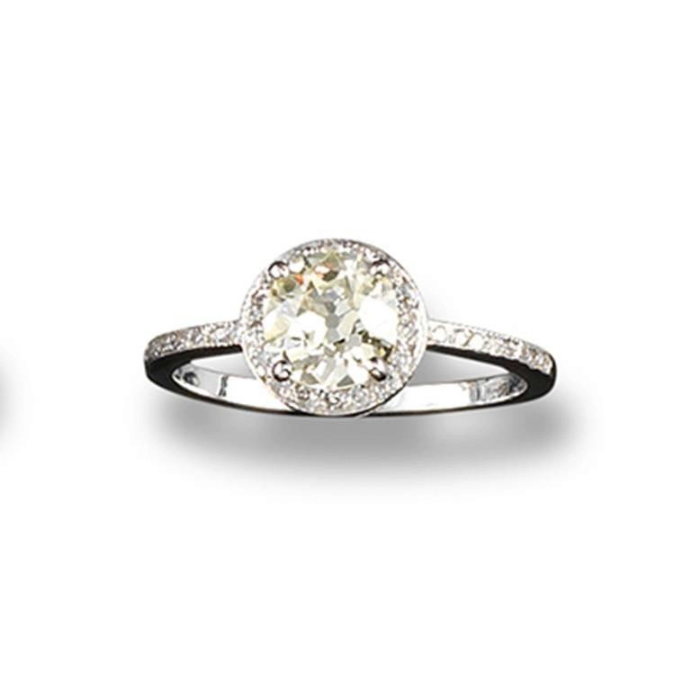 A diamond solitaire ring, the old circular cut diamond weighs approximately 1.15cts and is set within a surround of smaller diamonds in white gold. Size L.