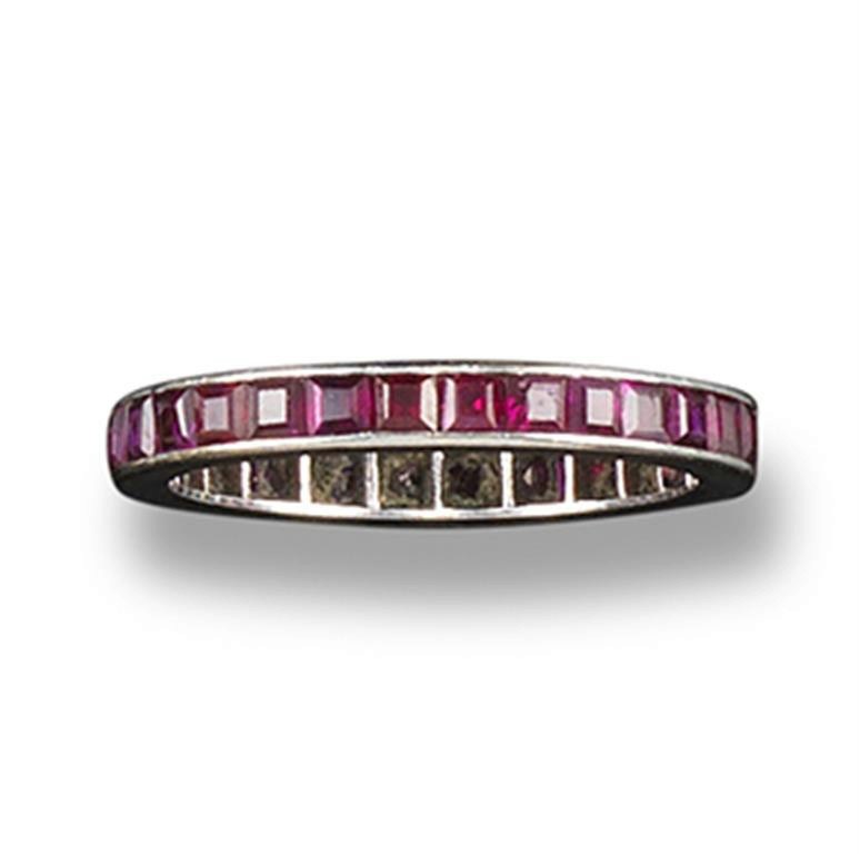 A full circle ruby eternity ring, the calibré cut rubies set in platinum. Size N.