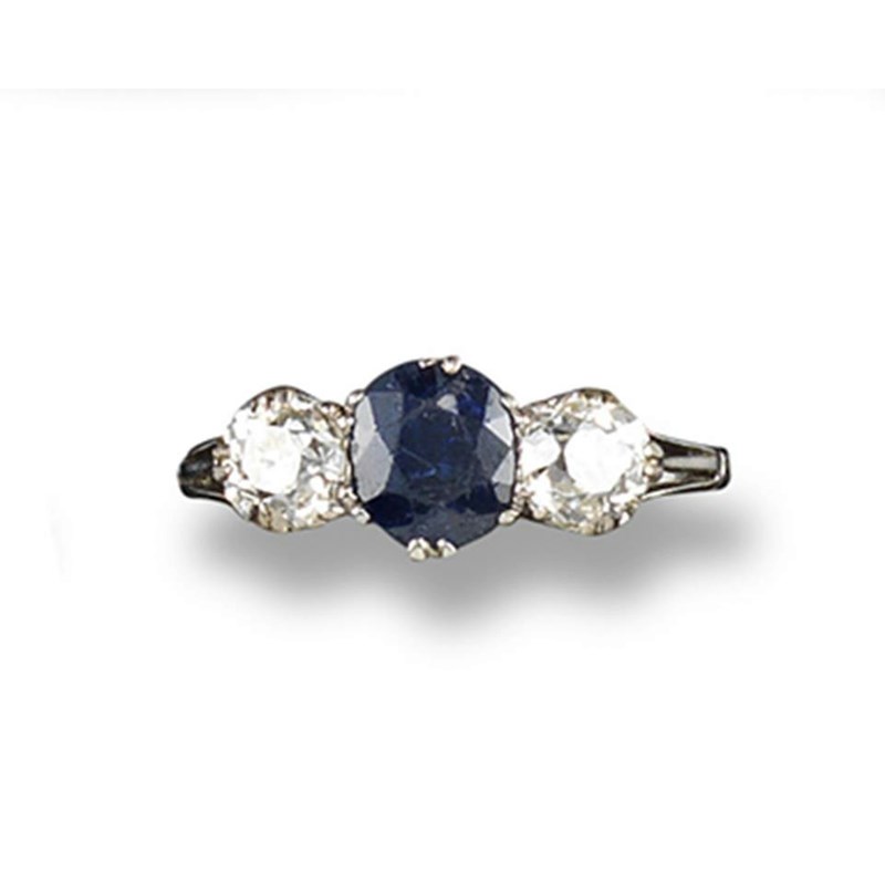 A sapphire and diamond three stone ring, the oval shaped sapphire is set with two old circular cut diamonds in platinum and white gold. A sapphire and diamond cluster ring, the oval shaped sapphire is set within a surround of twelve circular cut diamonds in platinum and gold. Size O.