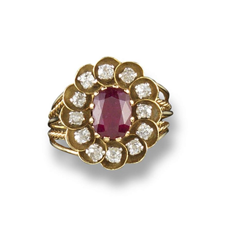 A ruby and diamond cluster ring, the oval shaped ruby is set within yellow gold scallop shaped mount set with twelve small cushion shaped diamonds. Size L.