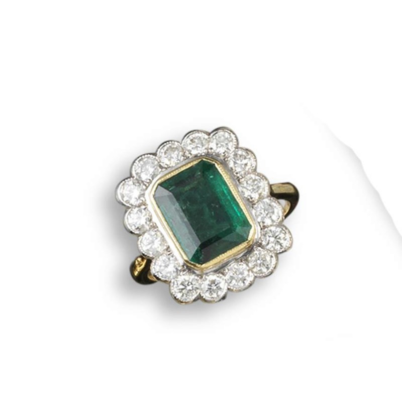 An emerald and diamond cluster ring, the emerald cut emerald is millegrain set in a yellow gold mount within a surround of sixteen circular cut diamonds in platinum. Size Q 1/2.
