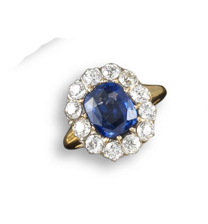 A sapphire and diamond cluster ring, the cushion shaped sapphire weighs approximately 3.80cts and is set within a surround of old circular cut diamonds in yellow gold and platinum. Size Q.