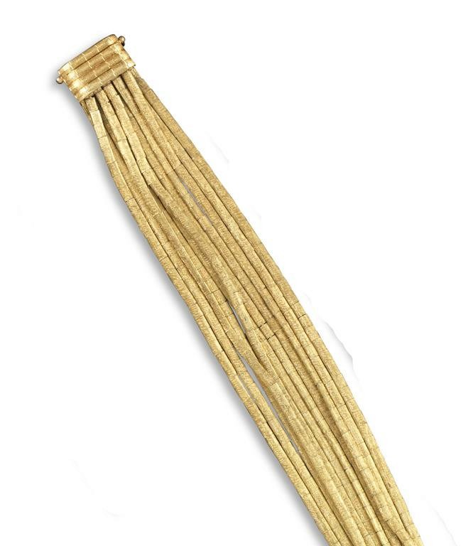 An 18ct textured yellow gold eleven strand bracelet, 19cm. 75g.