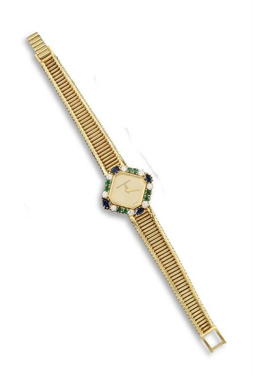 A gem-set gold ladies wristwatch by Bueche-Girod, signed plain gold dial, the bezel mounted with sapphires, emeralds and diamonds. 18ct yellow gold graduated baton link band. 17cm.