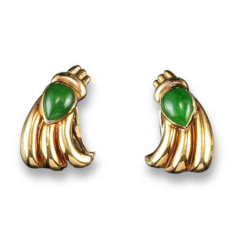A pair of jade and gold scroll earrings, set with pear shaped jade cabochons.